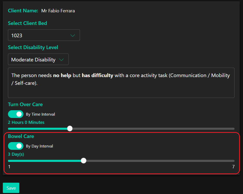 If a Client requires regular checkups for bowel movements, click the toggle switch to enable this function.