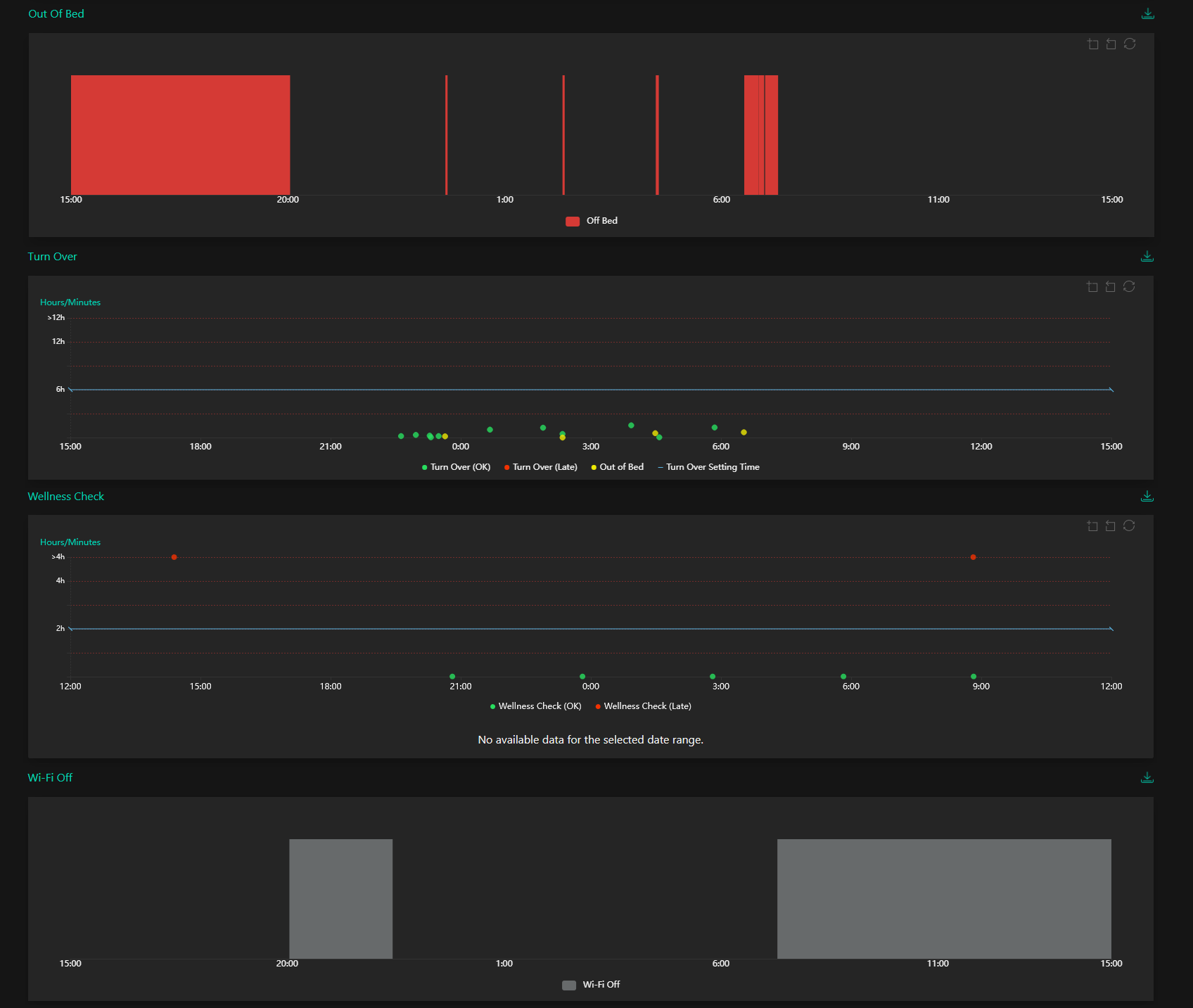 Summary. This displays the total times out of bed during scheduled sleep hours, total number of alarms, heart rate, respiratory rate, ratio of heart and respiratory rate and a calculated rating of the client's sleep quality (See Appendix: Sleep Score Calculation Table).