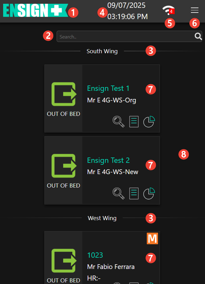This is the normal operating page where carers can view the real time status of each Client in their care. The image below is an example of a system that has been setup and a detailed explanation on how to setup a system is documented under System Setup in this user manual.