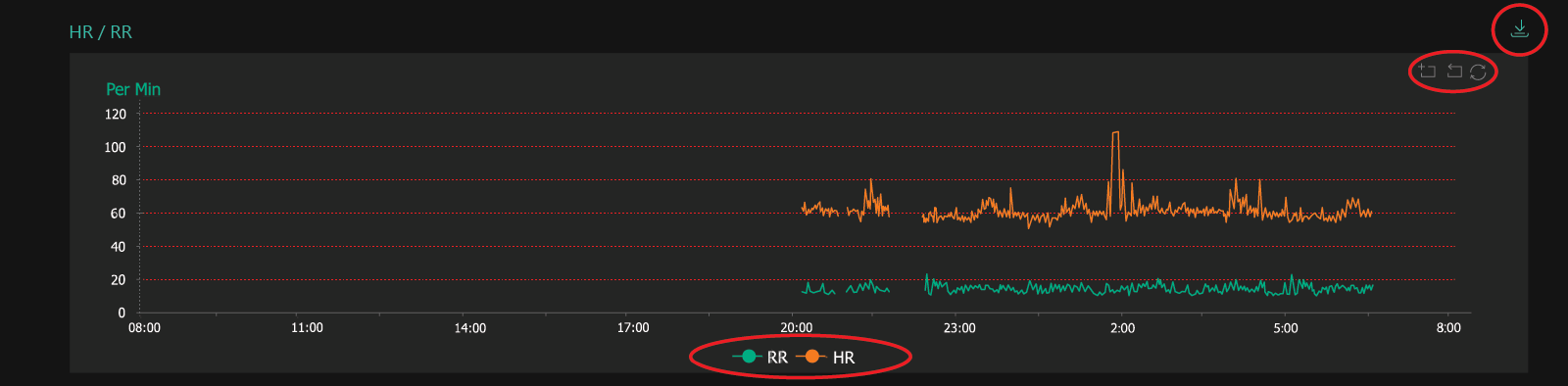 Hovering with the cursor anywhere on the graph will display the heart rate and respiratory rate for a specific time and date.