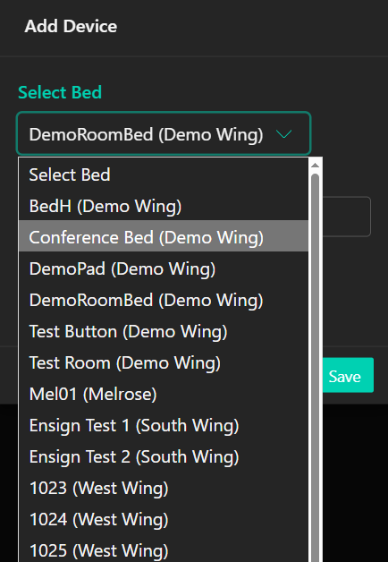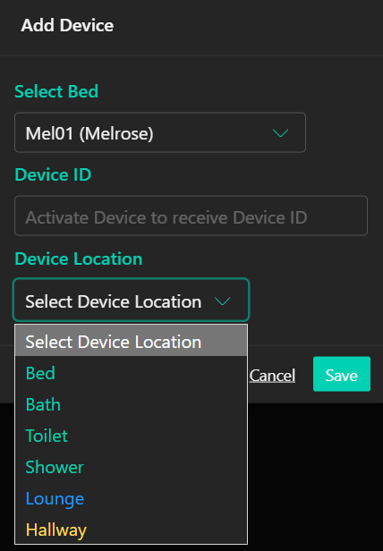 Third, select a Location for the device from the drop-down menu. Bed, Bath, Toilet, Shower are available options by default written in green. Any additional locations currently assigned to another Device will be blue. Multiple devices may be assigned to a location. Any additional locations yet to be assigned to a device will be yellow.