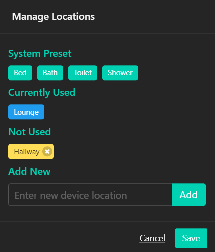 "Bed", "Bath", "Toilet" and "Shower" are available by default. To add a new Location, type in the box then click "Add." New Locations yet to be assigned to a Device will be yellow. New Locations assigned will be blue. Only yellow Locations may be deleted.