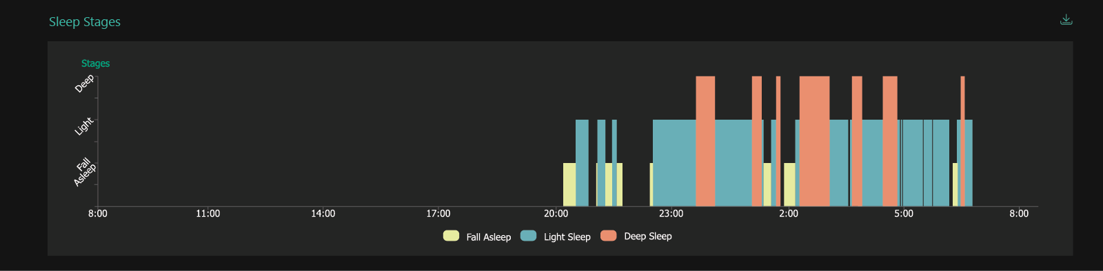 Displays the three stages of: Falling Asleep, Light Sleep and Deep Sleep of the client for the time frame selected. By clicking on the legend colours each Sleep Stage can be switched on or off to simplify the graph. Hovering over any of the representative bars of the sleep stages on the graph will display the Sleep Stage's name and accurately display the start and finish time of that stage.